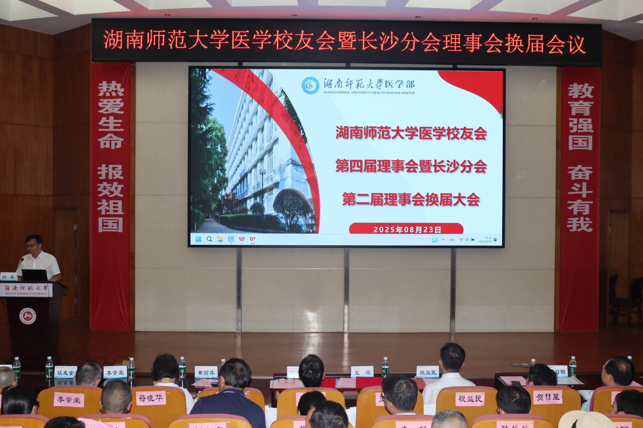 湖南师范大学校友总会、教育基金会秘书长黄丽萍宣读《关于湖南师范大学医学校友会第四届理事会暨长沙校友分会第二届换届的批复》。她高度赞扬医学校友会对母校发展与事业推动所做出的卓越贡献,并深深感动于一代代医学校友热心反哺母校的情怀。黄丽萍表示,校友总会将一如既往全力服务校友、支持学校“双一流”建设。