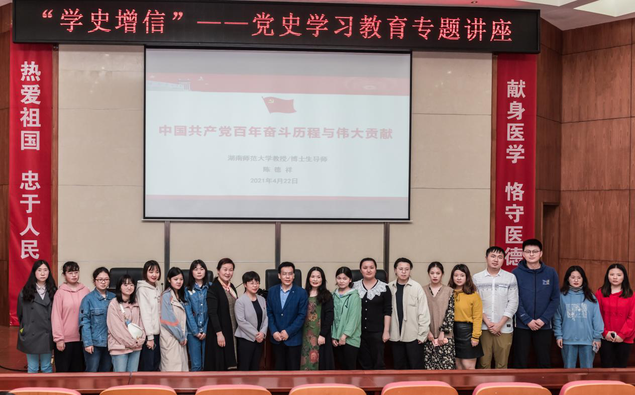 4月22日下午,我院在仁医楼报告厅举行“学史增信”党史学习教育专题报告会,全体教职工和学生党员到会听取了马克思主义学院教授、博士生导师陈德祥讲座“中国共产党百年奋斗历程和伟大贡献”,院党委书记鄢朝晖主持报告会。